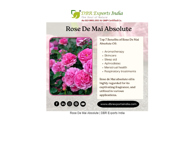 DBR Exports India is one among the best Rose de Mai absolute suppliers from India, which offers great quality at reasonable price point, where you can Buy Rose De Mai Absolute online as well with delivery to the majority part of the world.